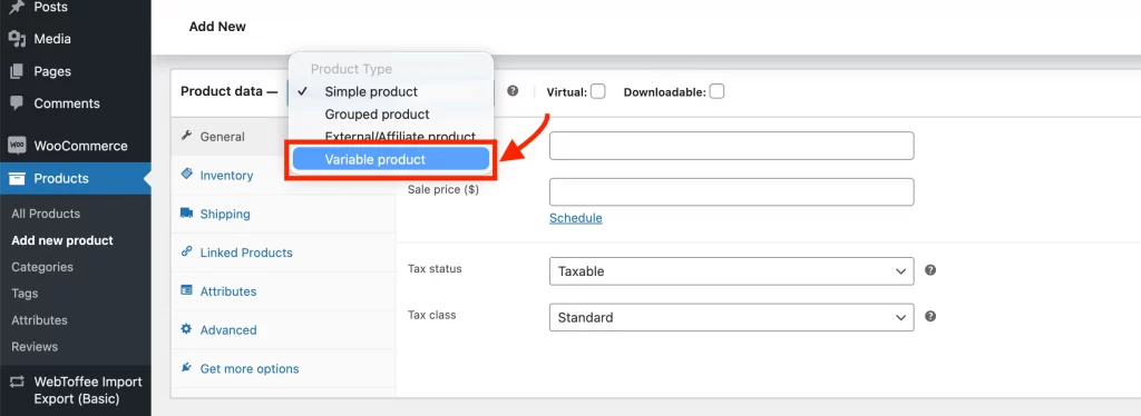 From the dropdown menu, change the product type from “Simple product” to “Variable product.”